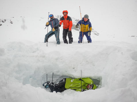 Před večeří, už v blízkosti chaty, pak proběhne výuka a následný trénink lavinové záchrany (manipulace s lavinovým vyhledávačem a správné vyhledávání, sondování a kopání, celková organizace lavinové záchrany a volání profesionální záchrany).
